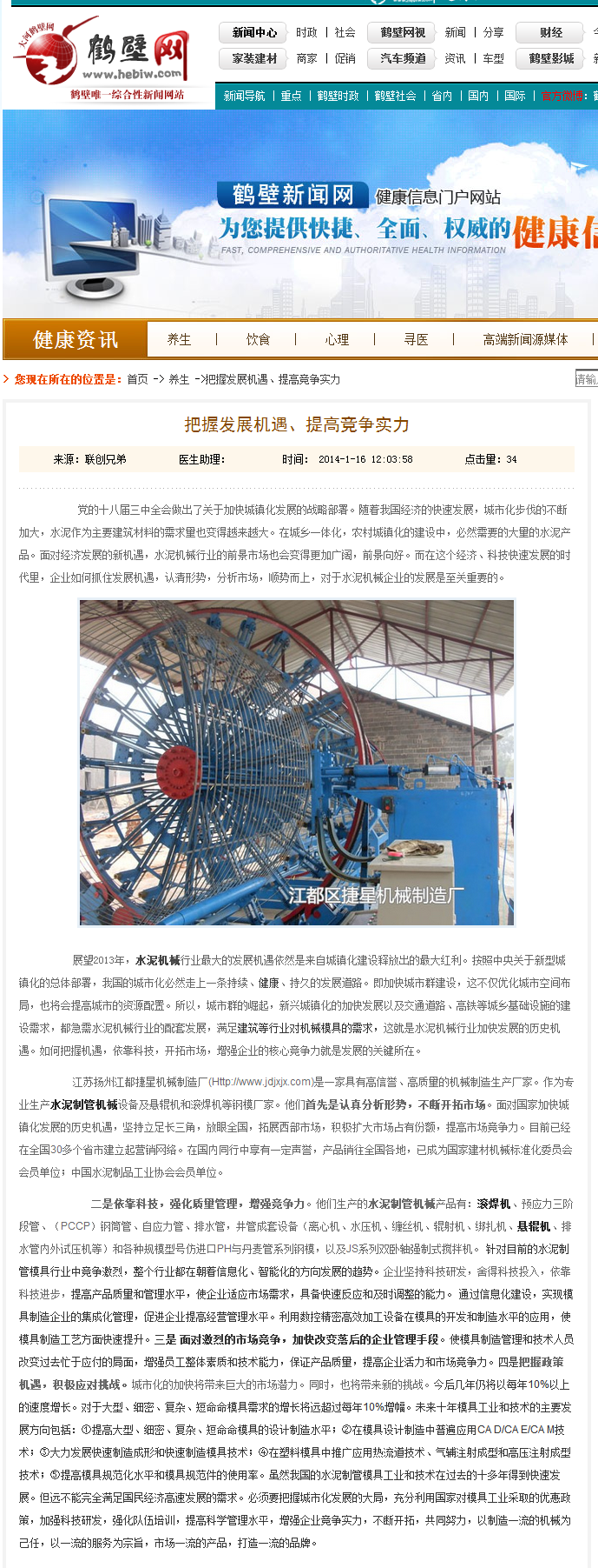 地方政府門戶網(wǎng)站鶴壁日?qǐng)?bào)社鶴壁新聞網(wǎng)對(duì)懸輥機(jī)、滾焊機(jī)、芯模振動(dòng)模具廠家江都捷星機(jī)械的相關(guān)報(bào)道